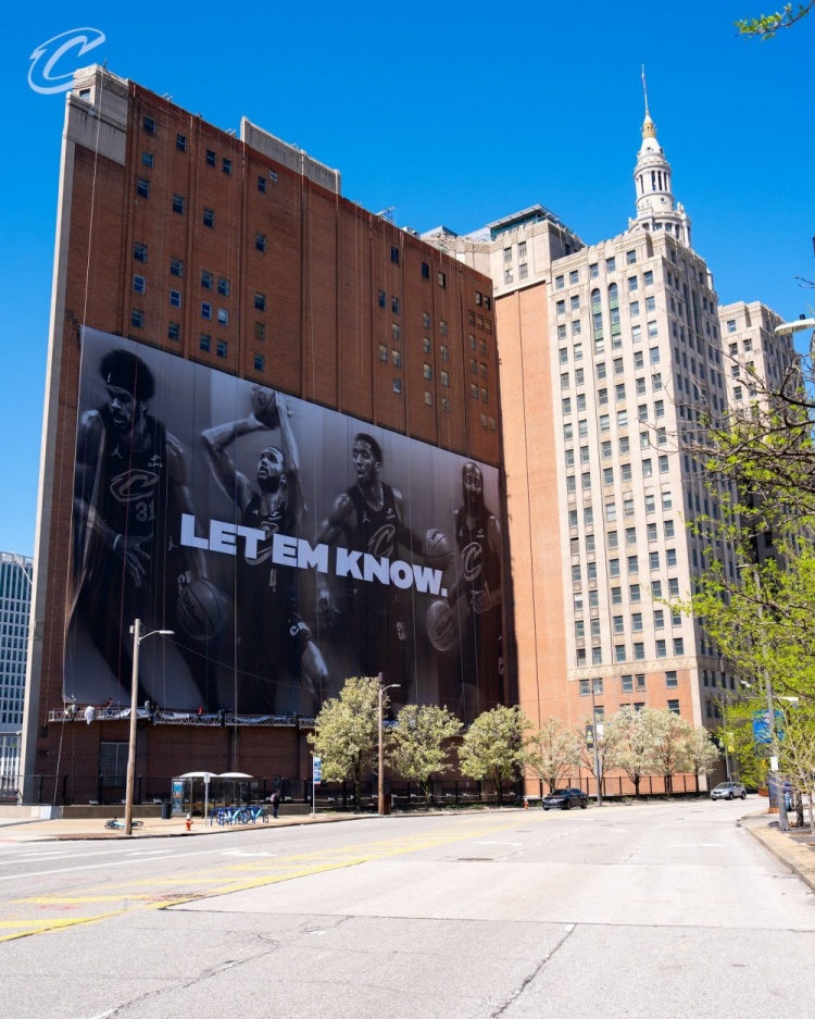 4月18日讯 今日,ESPN克利夫兰分台官推晒出一张照片,展现骑士主场附近建筑上为迎接季后赛而悬挂的全新巨幅海报。